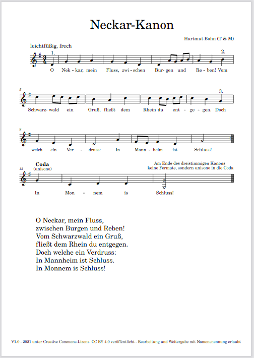 Deshalb habe ich für alle Sängerinnen und Sänger, von der Neckarquelle in Schwenningen bis hinunter ans Ende des Neckars in Mannheim, einen scherzhaften kleinen Kanon geschrieben: